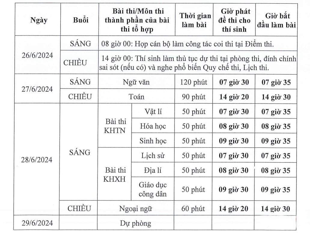 Trong đó, ngày 26/6, thí sinh làm thủ tục dự thi. Ngày 27, 28/6/2024, các thí sinh dự thi tốt nghiệp THPT. Ngày 29/6/2024 sẽ là ngày thi dự phòng.