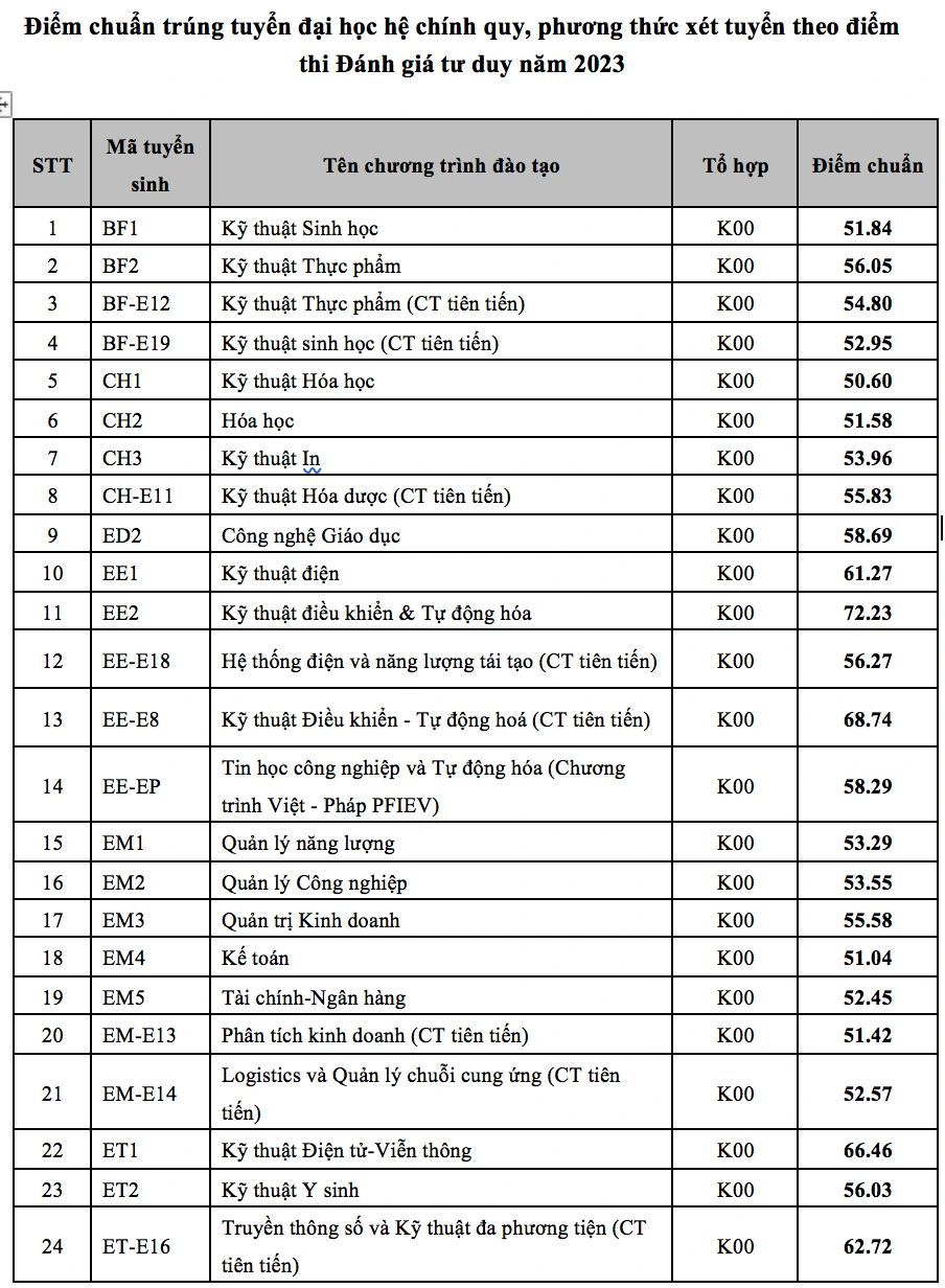 - Xét tuyển theo điểm thi Đánh giá tư duy (ĐGTD) năm 2023, tổ hợp K00, thang điểm 100: