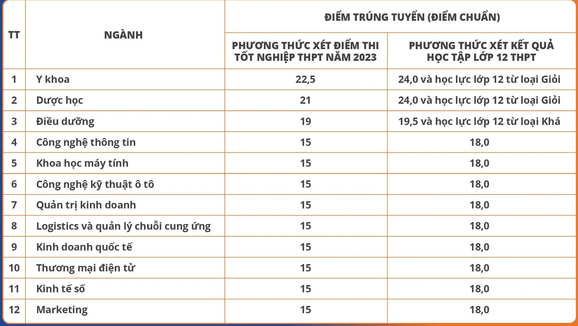 Ở phương thức xét học bạ lớp 12, y khoa và dược cùng có mức điểm chuẩn 24 kèm điều kiện học lực năm lớp 12 đạt loại giỏi.