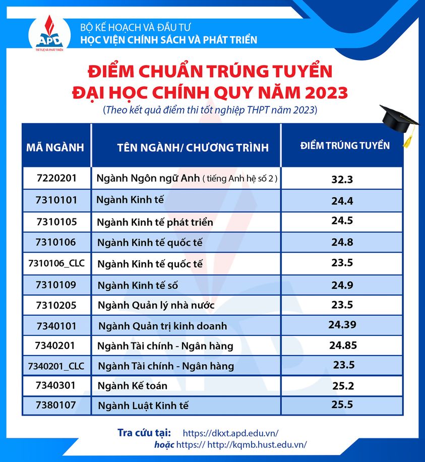 Điểm chuẩn Học viện Chính sách và Phát triển năm 2023. Học viện Chính sách và Phát triển lấy điểm chuẩn từ 23,5 đến 25,5 ở phương thức xét điểm thi tốt nghiệp.