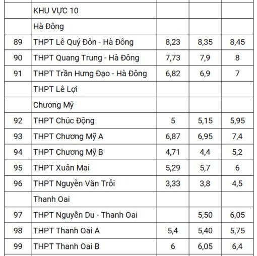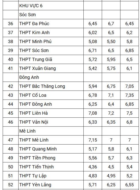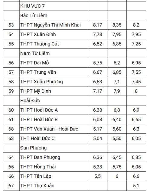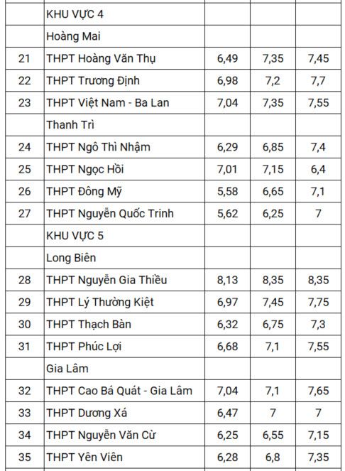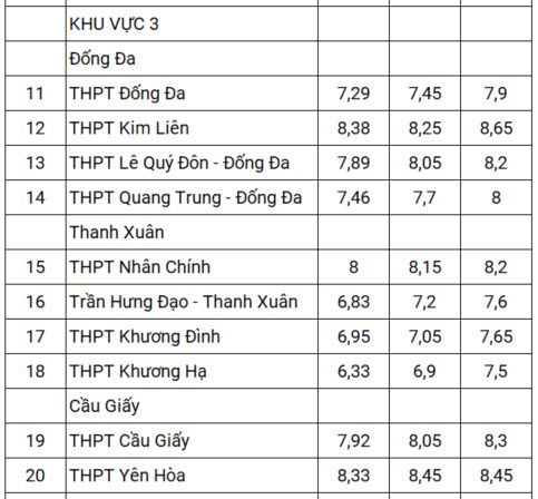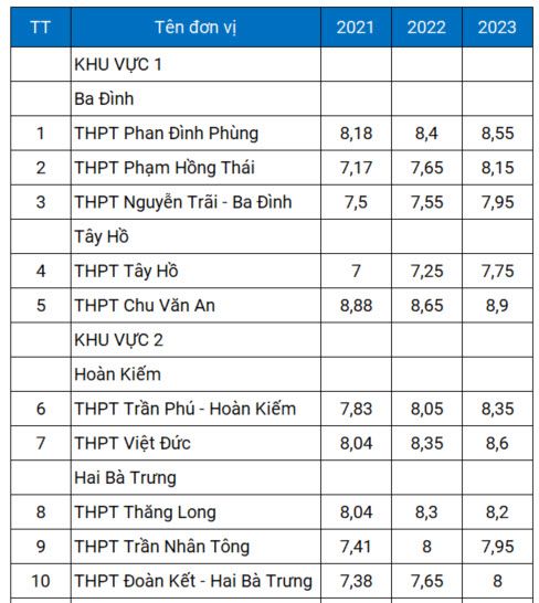 Điểm chuẩn lớp 10 trong ba năm 2021-2023 của gần 120 trường THPT ở Hà Nội, được tính theo điểm trung bình các môn, cụ thể như sau: