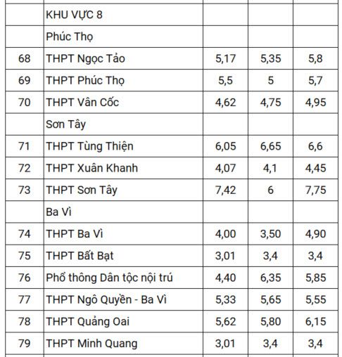 Hàng loạt trường Đại Cường, Mỹ Đức C, Ứng Hòa B, Lưu Hoàng, Hợp Thanh, Tân Dân, Nguyễn Văn Trỗi, Bắc Lương Sơn, Ba Vì, Bất Bạt, Minh Quang không lấy quá 5 điểm/môn trong nhiều năm qua, không riêng giai đoạn 2021-2023. Trong đó, nhiều trường chỉ lấy điểm chuẩn hơn 3 nhưng vẫn không đủ.