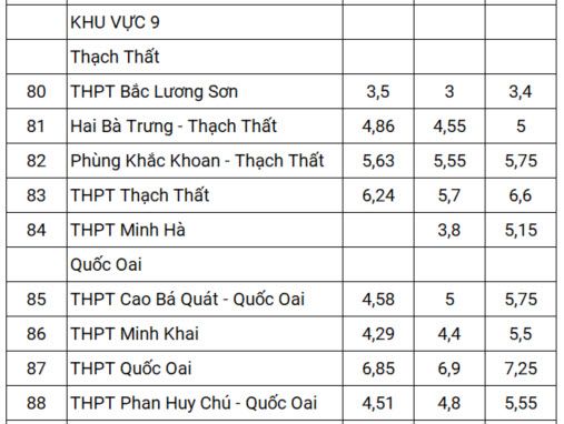 Chẳng hạn, trường THPT Nguyễn Trãi - Thường Tín lấy 4,66 điểm một môn vào năm 2021. Sau hai năm, con số này tăng lên 6,4, chênh lệch hơn 1,7 điểm. Tương tự, THPT Đông Mỹ (huyện Thanh Trì) tăng 1,52 điểm. Các trường có mức tăng trên 1 điểm còn có Khương Hạ, Ngô Thì Nhậm, Nguyễn Quốc Trinh, Bắc Thăng Long, Đại Mỗ, Vạn Xuân - Hoài Đức, Phổ thông dân tộc nội trú, Cao Bá Quát - Quốc Oai, Vân Tảo...