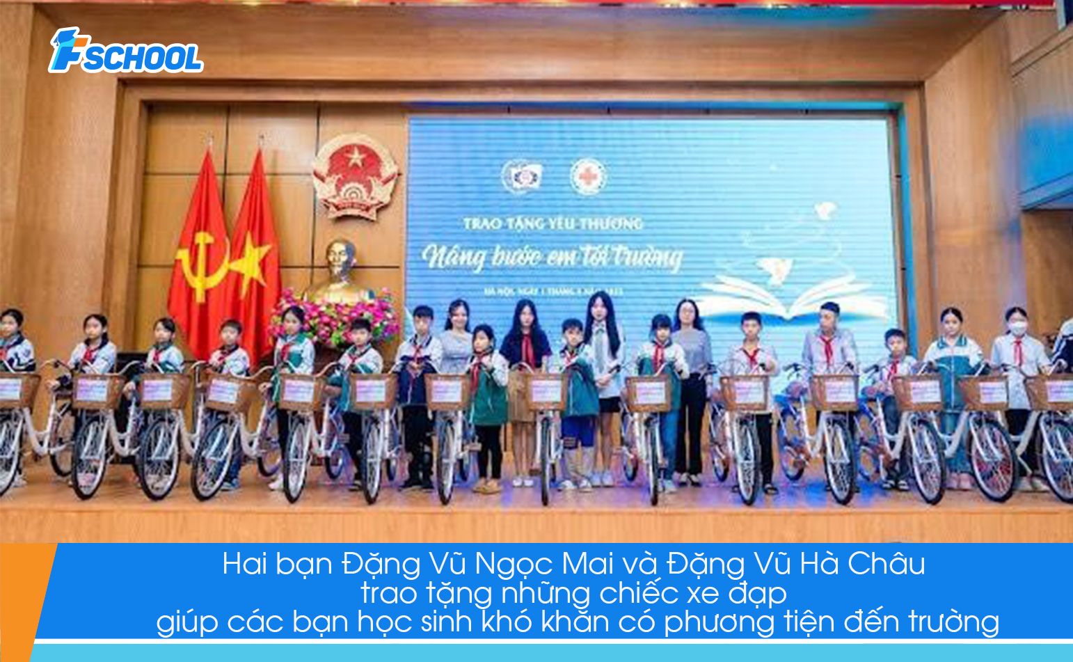 Cũng trong dịp này, các bạn Đặng Vũ Ngọc Mai và Đặng Vũ Hà Châu cũng đóng góp vào chương trình “Nâng bước em đến trường” với 50 suất học bổng và 75 chiếc xe đạp thông qua Hội Chữ Thập đỏ Thành phố Hà Nội, tổng trị giá 200 triệu đồng, dành tặng các em học sinh có hoàn cảnh khó khăn, đạt thành tích cao trong học tập trên địa bàn Thành phố Hà Nội.