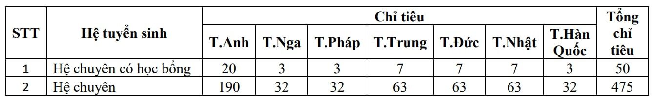 Năm 2024, tổng chỉ tiêu của trường THPT Chuyên Ngoại ngữ là 525 (gồm hệ chuyên và hệ chuyên có học bổng), tăng 25 chỉ tiêu so với năm 2023. Trong đó, cả hai hệ chuyên và chuyên có học bổng đều tăng chỉ tiêu, bởi năm nay trường không còn tuyển hệ không chuyên.