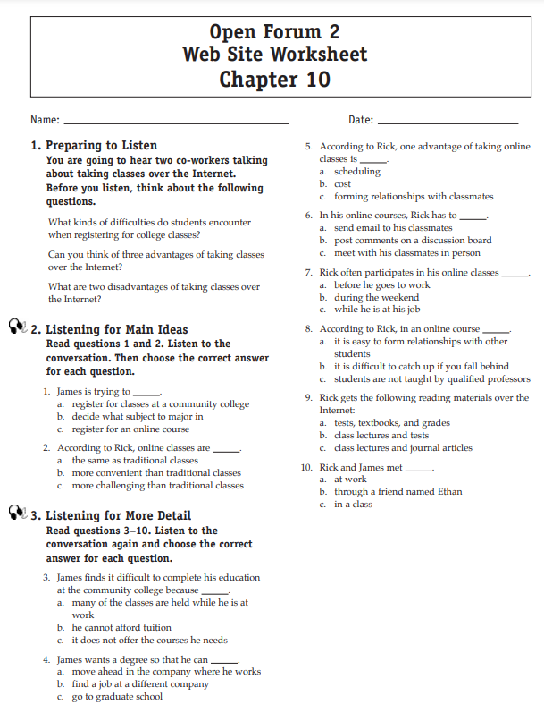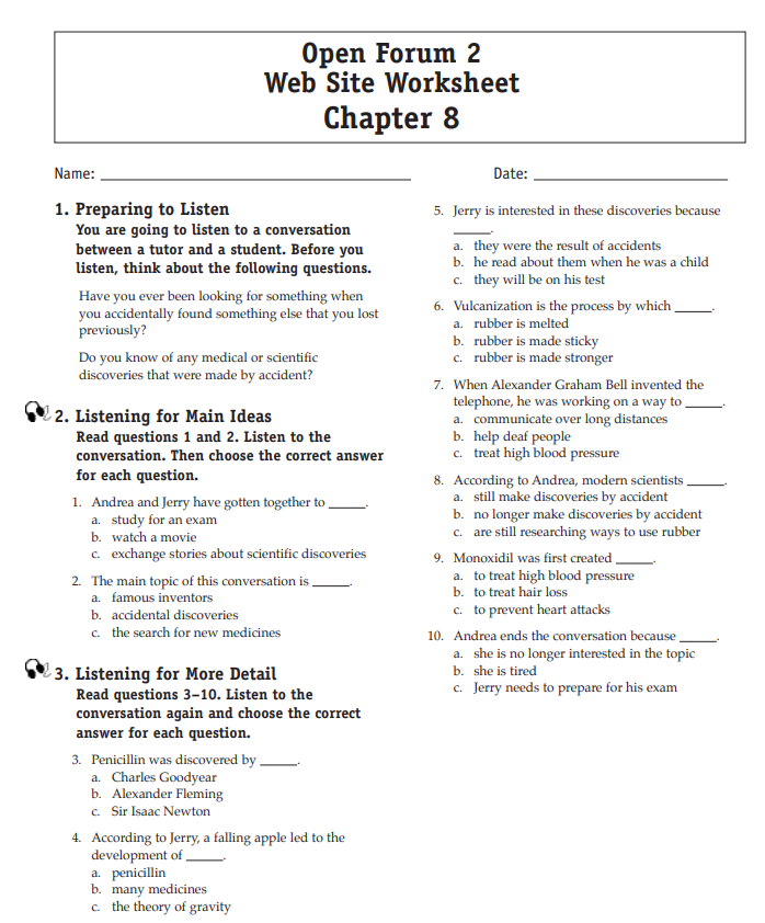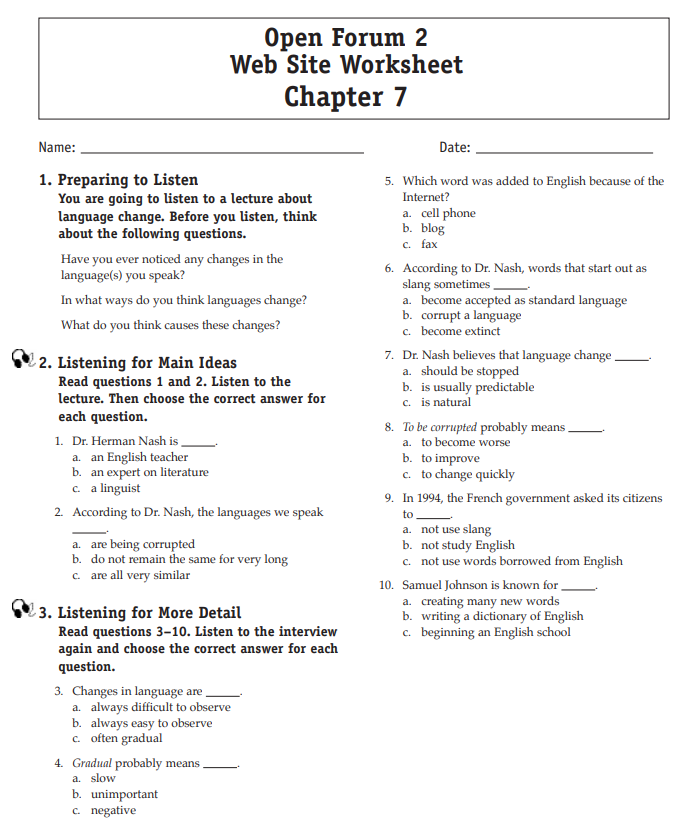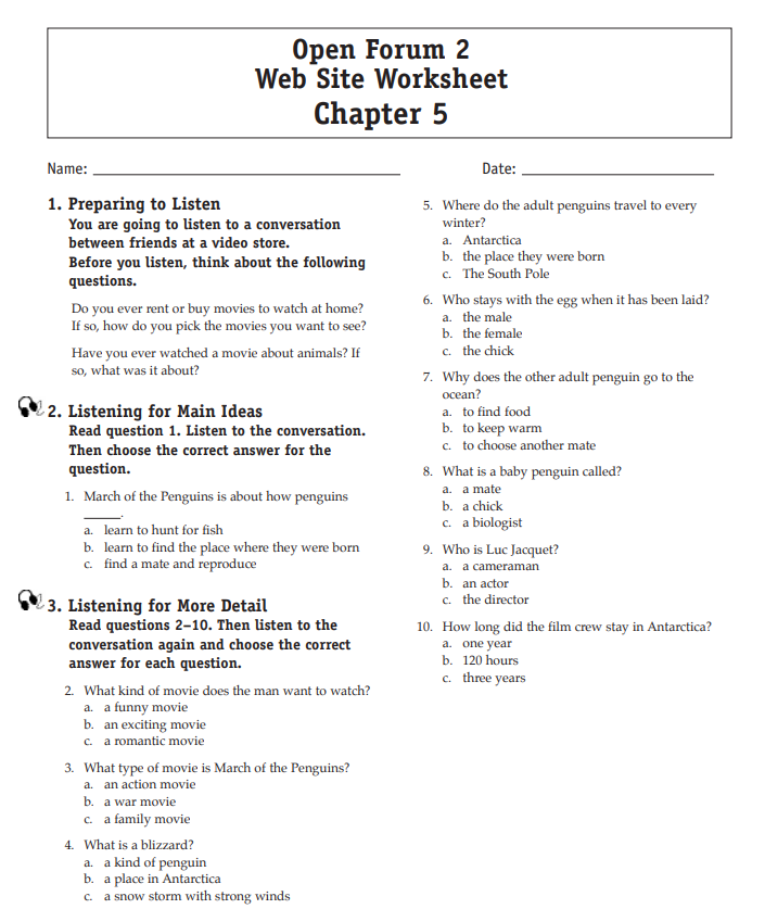 Download and print the worksheet for the chapter you would like more practice with. Then download the listening selection for that chapter.