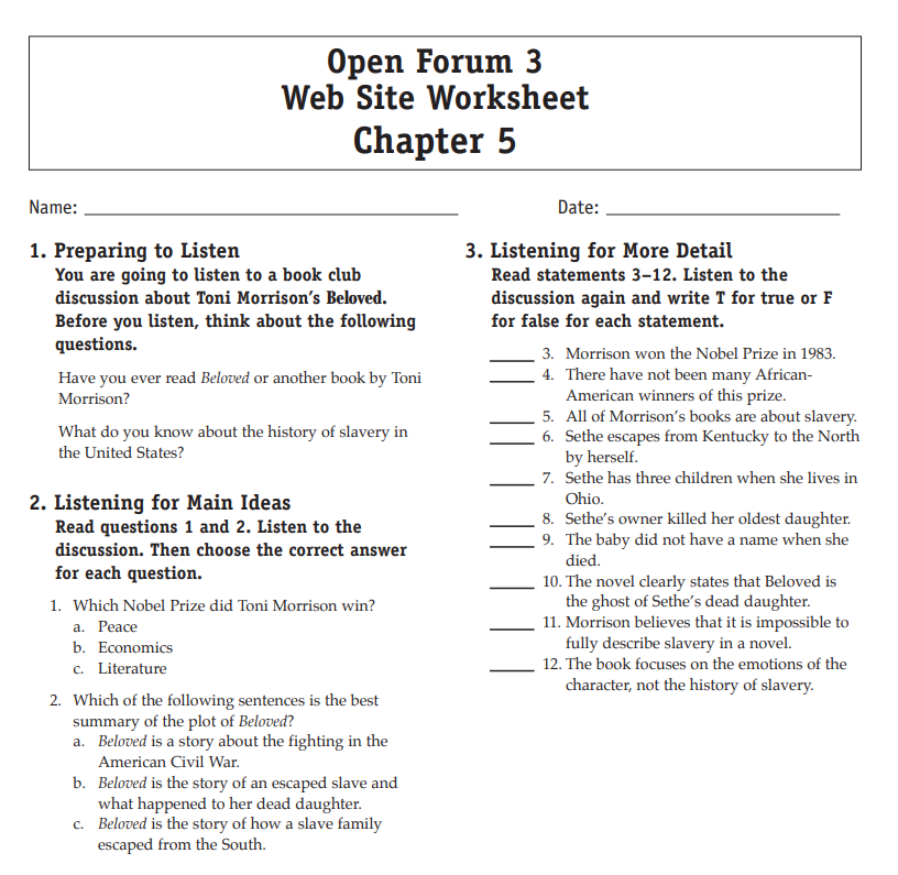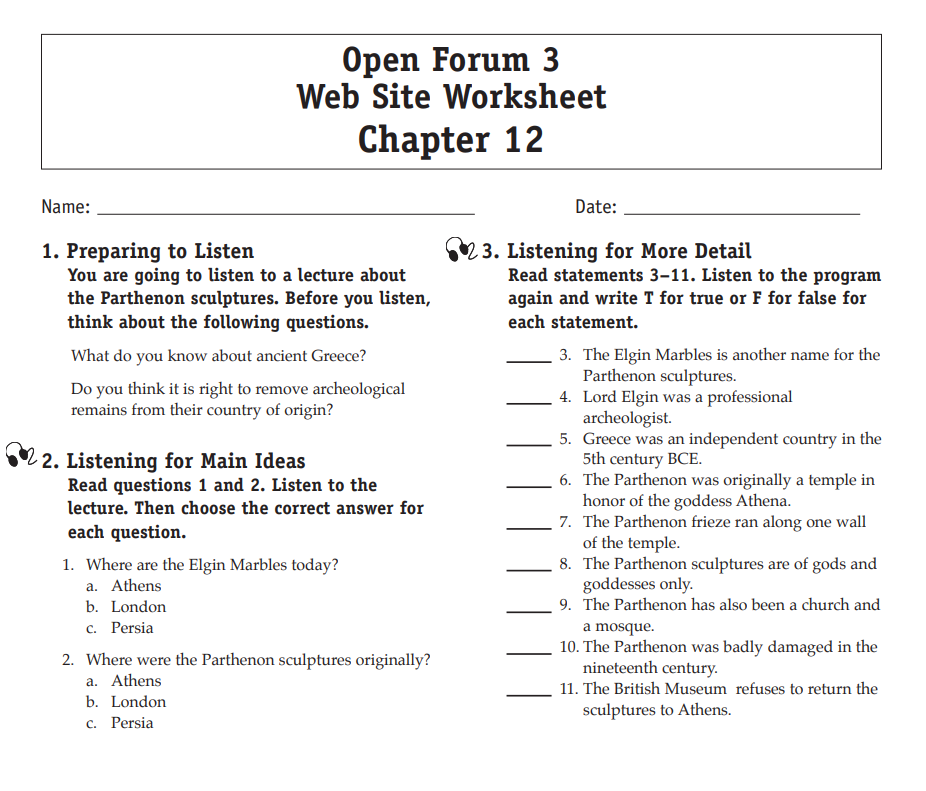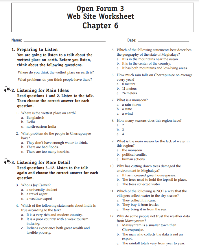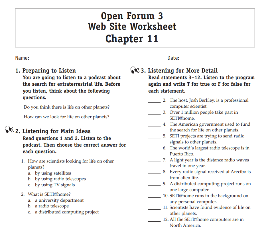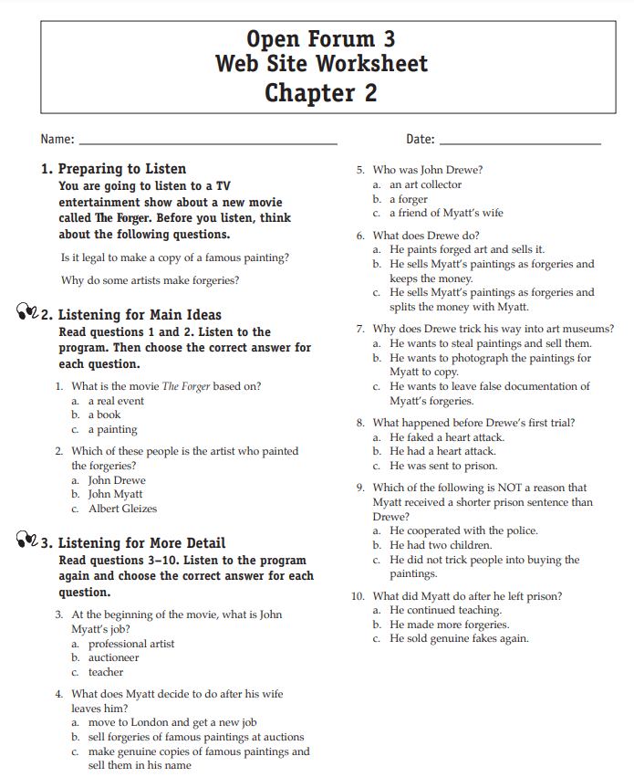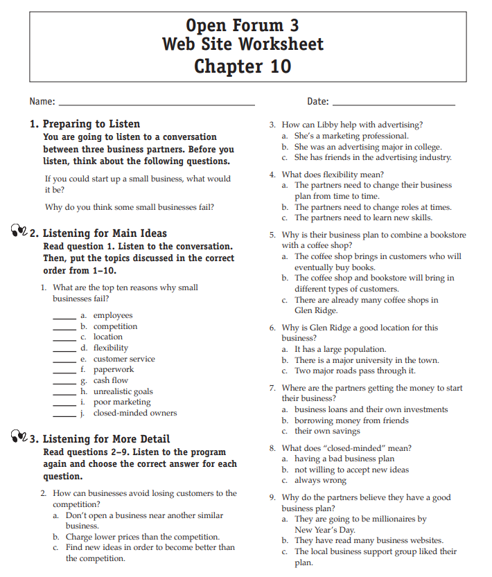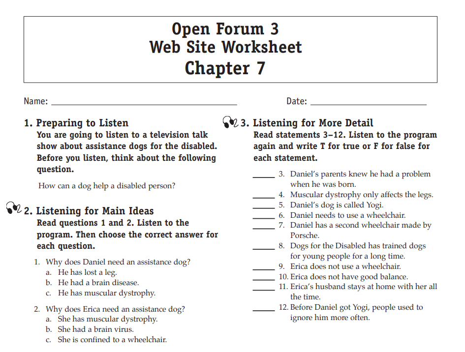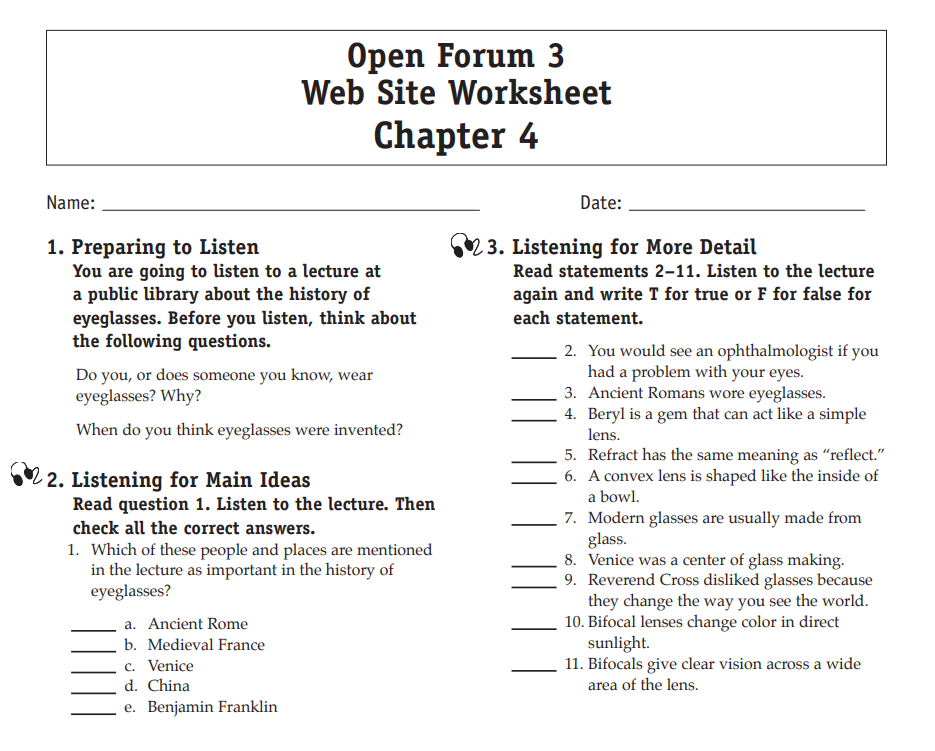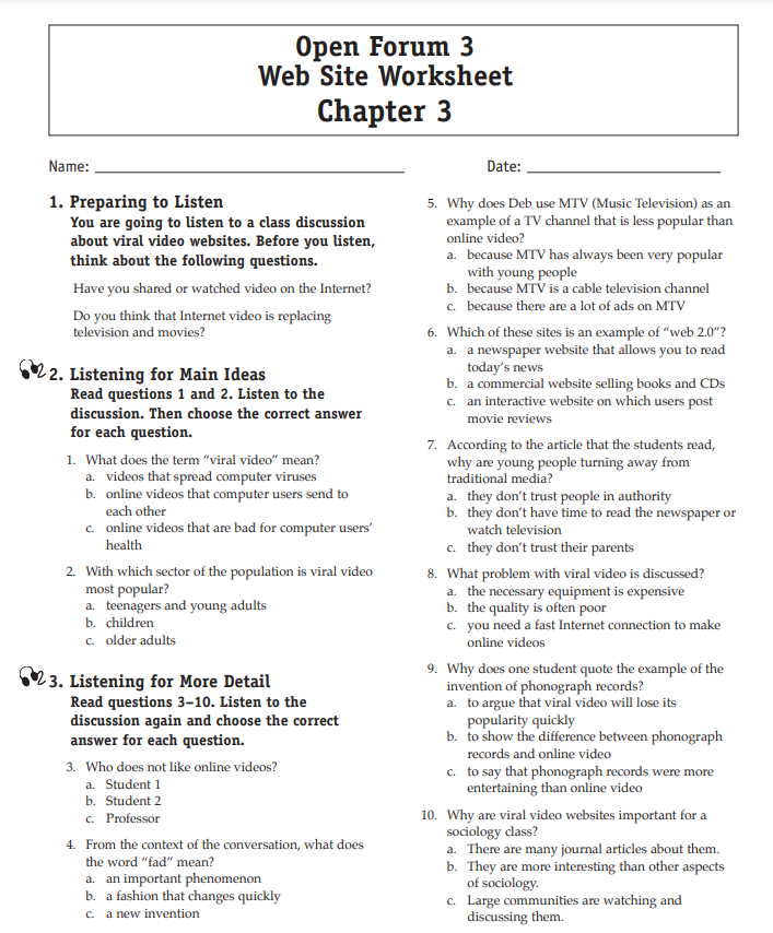 Download and print the worksheet for the chapter you would like more practice with. Then download the listening selection for that chapter.