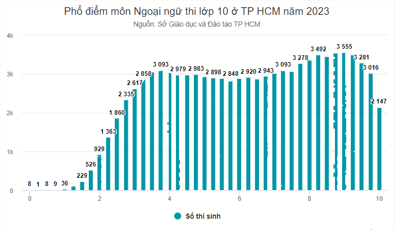 Sáng 20/6, Sở Giáo dục và Đào tạo TP HCM công bố điểm thi vào lớp 10 của gần 96.000 thí sinh. Môn Ngoại ngữ có khoảng 32% bài thi đạt điểm giỏi (8 điểm trở lên), cao nhất trong ba môn cơ bản. Số thí sinh đạt điểm tuyệt đối là 2.147 em, chiếm 2,2% số thí sinh dự thi, tăng mạnh so với số 478 của năm trước.